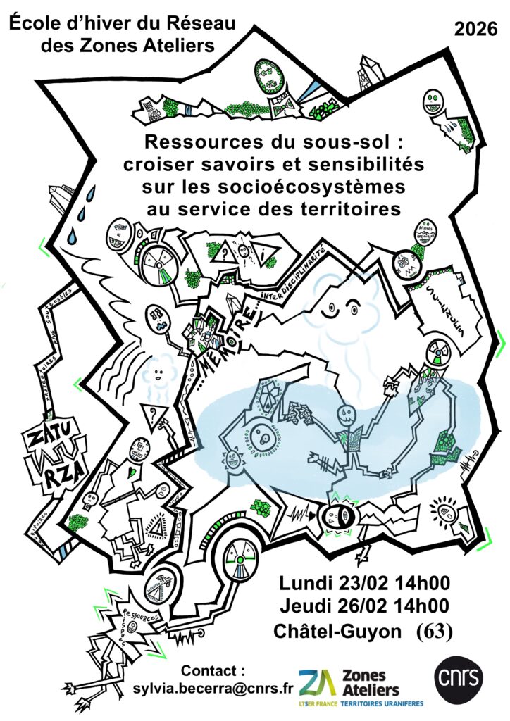 Affiche réalisée pour l’Ecole d’hiver du Réseau des Zones Ateliers du CNRS sur les socio-écosystèmes (organisée par la Zone Ateliers Territoires Uranifères).